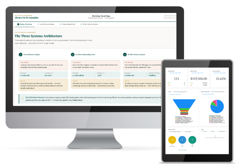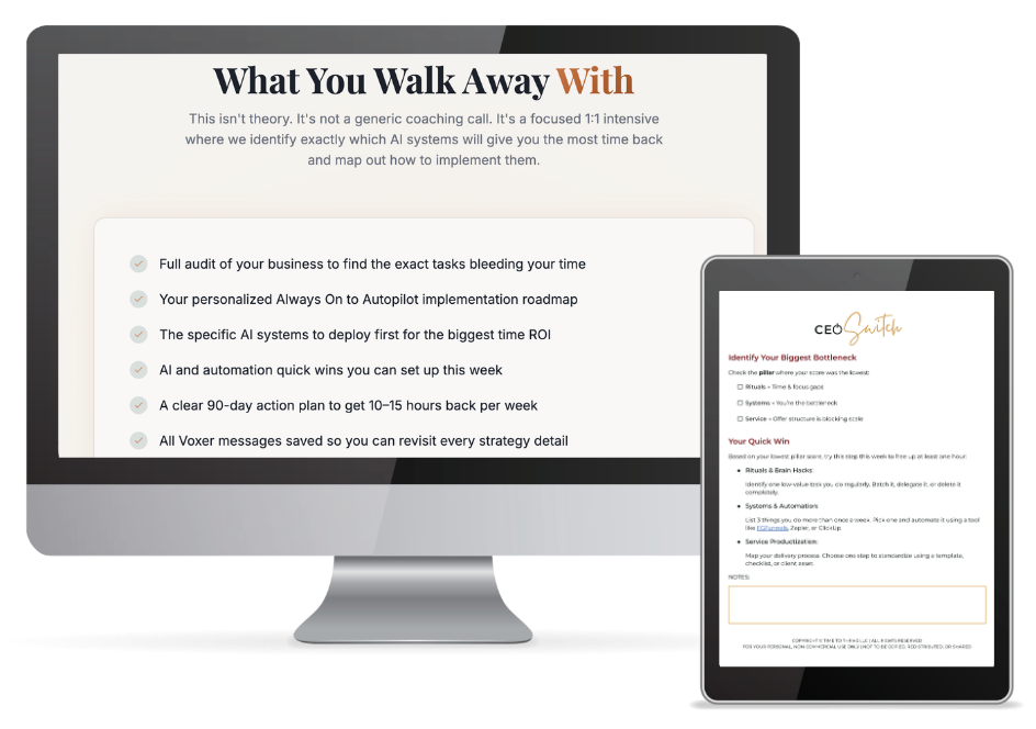You've built something real. Now let's make it run without you. In a private 1:1 CEO Switch Intensive, you'll get a custom diagnostic and automation roadmap for your business. Built around your tools, your bottlenecks, and your goals. Delivered in 3 business days.